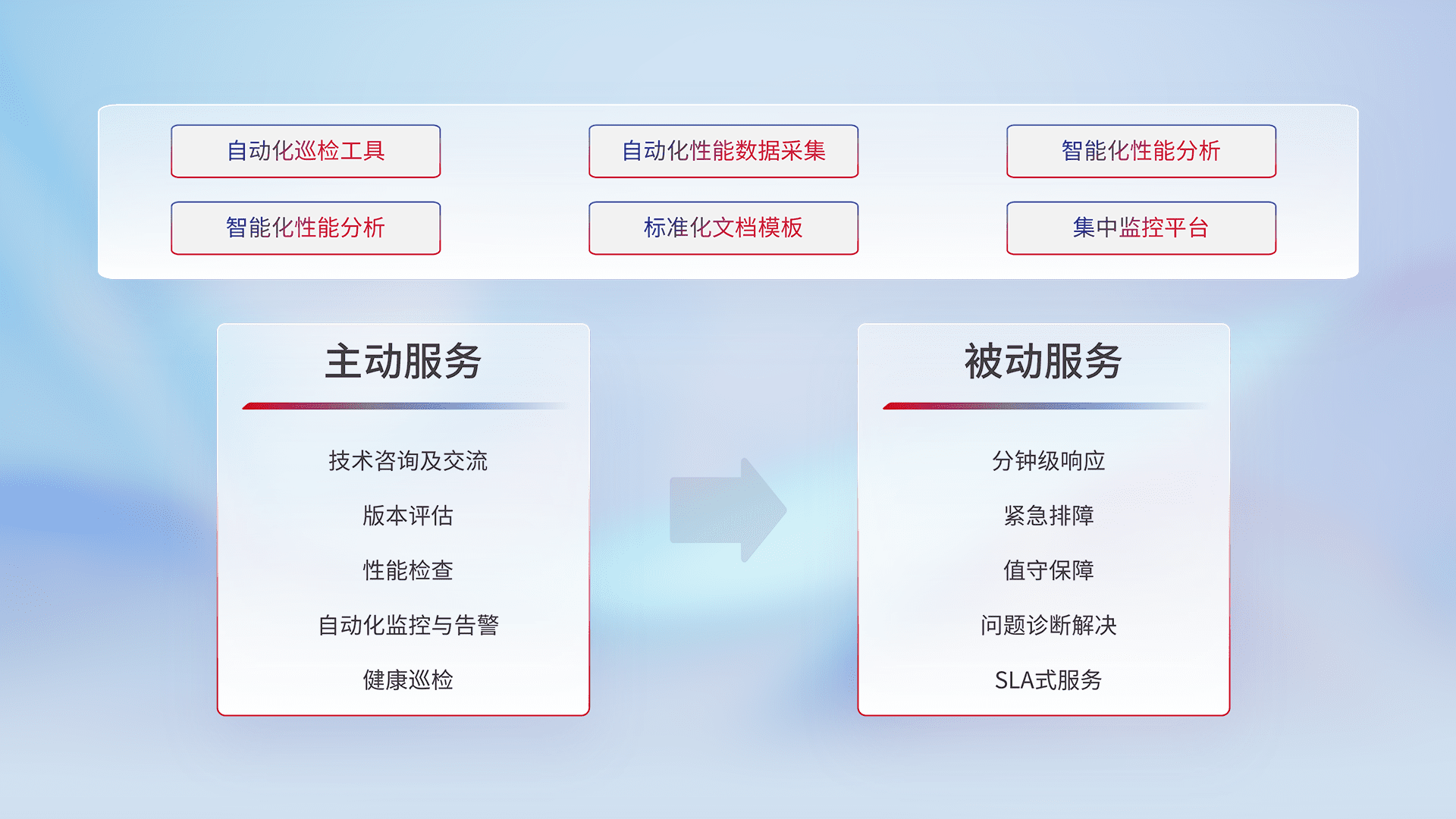 智能化工具和标准化文档,,,保障服务质量,,,,提供主动服务(包含技术咨询、、、版本评估、、、、性能检查、、、自动化监控与告警、、、、健康巡检)和被动服务包含(分钟级响应、、、、紧急排障、、、、值守保障、、问题诊断解决、、、、SLA服务)。。