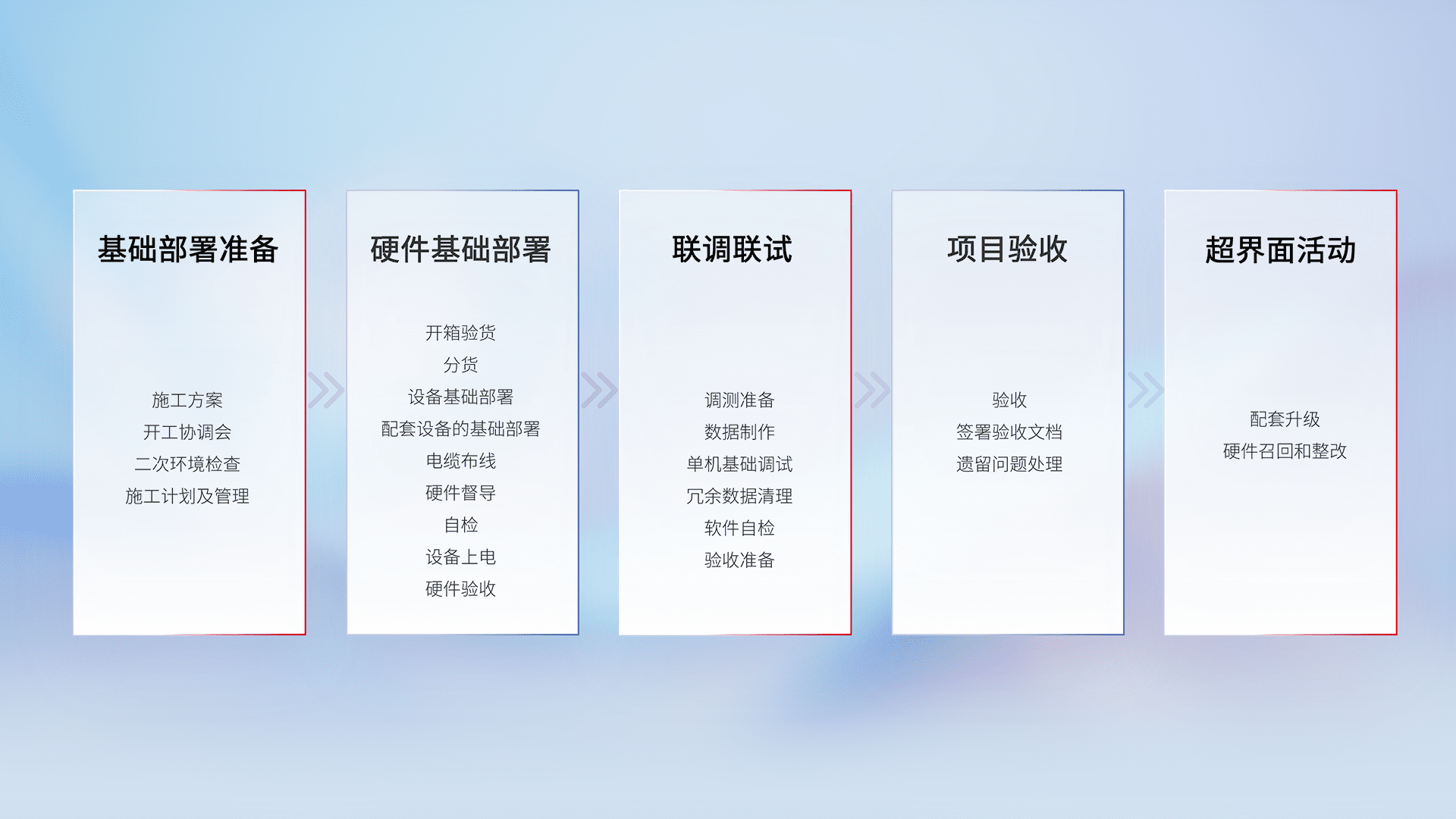 从基础部署准备、、、硬件基础部署、、、、联调联试、、、、项目验收、、、、越界面活动的全过程可追溯,,,保证施工质量和进度。。